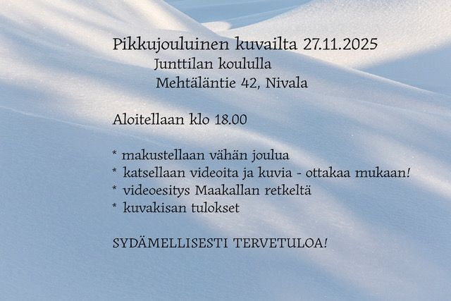 Suomenselän Luontokuvaajille on jälleen tulossa loppuvuodesta perinteinen pikkujouluinen kuvailta. Päivitämme tänne tilaisuuden ajankohdan, ohjelman ja paikan. Seuraa siis tätä Ajankohtaista -sivua!