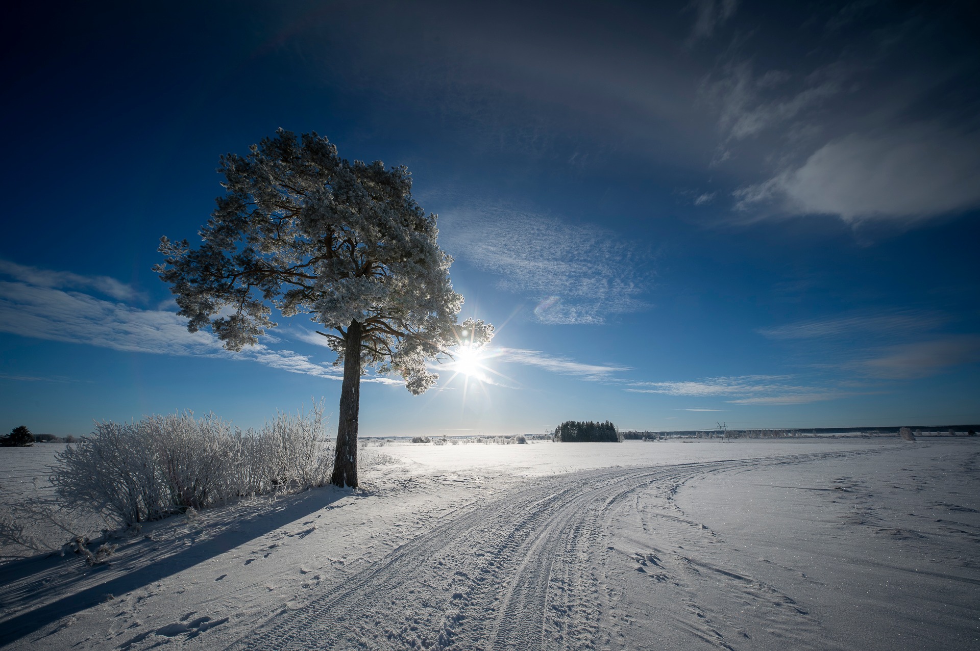 Pakkasaurinko + lumi = vahvat kontrastit ja varjot.